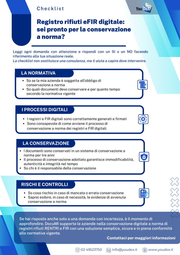 La tua azienda è conforme alla normativa? Per valutare se il processo di conservazione del FIR digitale rispetta gli obblighi vigenti abbiamo preparato una checklist operativa. Scaricala gratuitamente e rispondi alle domande in maniera sincera e obiettiva.